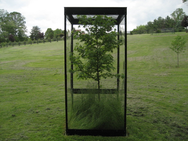 Conducted over the course of a year, a steel and plexiglass structure formed a contained environment for a sapling tree. The tree was documented periodically and all fallen leaves were collected. The final presentation consists of every leaf the tree produced in that annual cycle, along with projected documentation of the tree throughout the seasons.